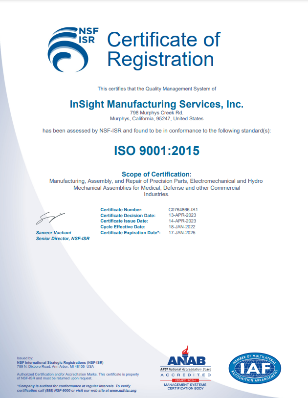 Quality is pervasive in all aspects of what we do at InSight Manufacturing Services. We are committed to exceeding our customers’ expectations by understanding their requirements and incorporating them into our strict quality guidelines. Our goal is to ensure manufacturing and service excellence at all levels of our operation.